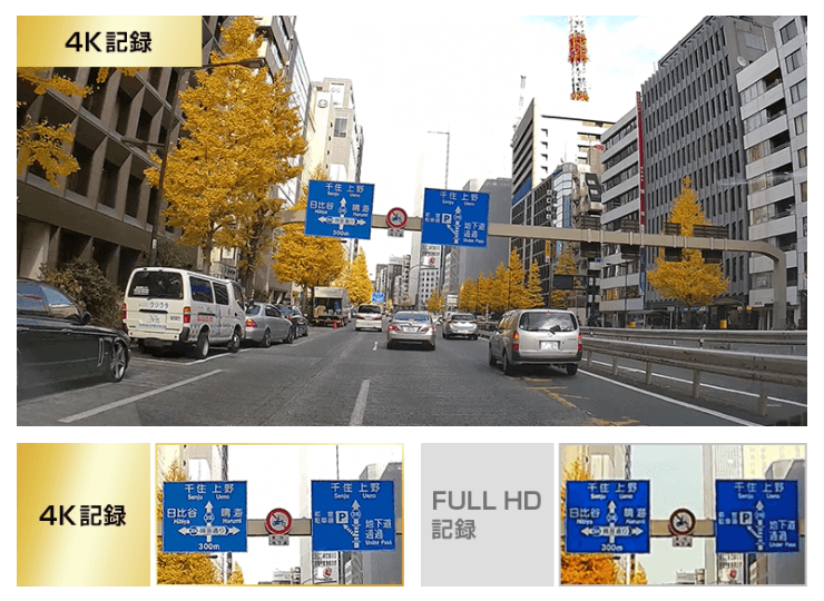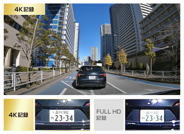フロントカメラは4K記録(ULTRA HD)を実現。超高解像度記録で、前方車や通行人、看板など周囲の状況を従来より約4倍くっきりと記録します。